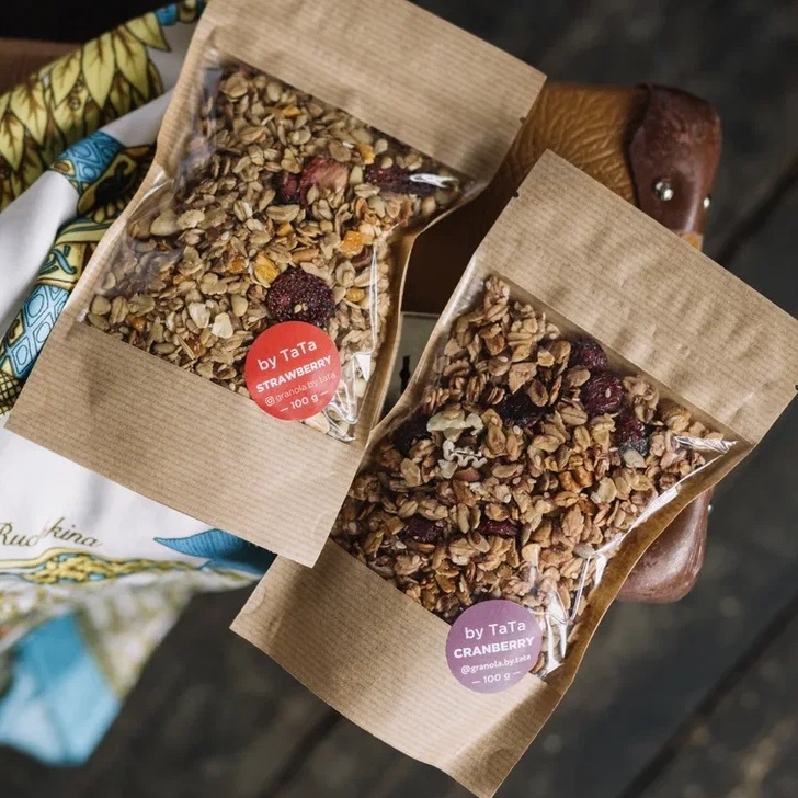 цельные овсяные хлопья или безглютеновая зеленая гречка, только высококачественные орехи, семена льна, ягодные и фруктовые пюре, которые я делаю самостоятельно, вяленые фрукты и ягоды, сушеные ягоды, семечки тыквы или подсолнуха, натуральная кокосовая стружка, кунжут, мёд или натуральный сироп, оливковое или кокосовое масло, пряности.